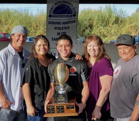 Summer, the second daughter of Benny III and Fawnee, played softball in high school, graduating in June, and is currently a freshman at UCLA. Their son, Benny IV (known as Kethnu by his family) has always been involved in many different sports but his favorite has been football. He started playing with the Junior All-American League from San Jacinto when he was eight. He started playing Junior Varsity football at San Jacinto, where is currently a senior. At the end of his freshman year he was promoted to the Varsity squad. Going to C.I.F. two years in a row, Benny IV recently received the Bob Stangel Award of Excellence for his outstanding performance during the 2017 season. Presented by the Hemet Sportsman's Club, the annual award chooses an overall winner among nominees from all local high schools that have a football program. On January 20, Benny IV was invited to be a starter in the Second Annual Riverside Sheriffs' Association All-star Football Classic, produced by the nonprofit organization Inland Valley Classic. The game featured the top senior prep football players in Riverside County. Benny IV looks forward to playing college football and has applied to several, including Ft. Lewis College in Colorado. Selaya, the youngest daughter of Benny IV and Fawnee currently plays basketball through the Inter Tribal Sports (ITS) program and is also playing softball.